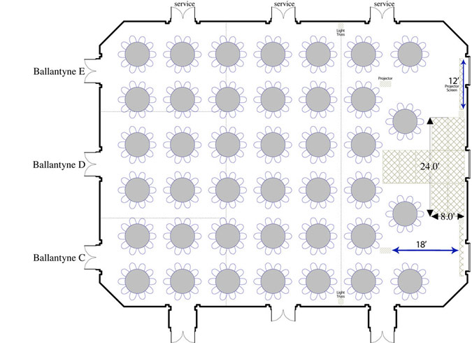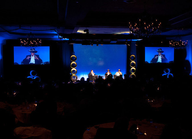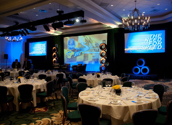 We began the production by brainstorming event themes with the client. Once one of our ideas was chosen and refined, we began designing a room layout and stage that best reflected the theme. In this case, the theme was "need for speed", so we incorporated racing tires on the stage and below the side projection screens to cohesively bring all visual elements together. We created the conference logo and designed a color lighting scheme that would best reflect the logo. After discussing the audio and visual goals with the client, we created a to-scale room and staging layout. We then compiled an equipment needs list which was met in part with our equipment and also items that were locally rented at the conference location. After negotiating equipment rental rates, we discovered that our time and equipment at the event was paid for by the savings we negotiated from the original equipment rental cost. On the week of the event, we traveled to the conference location, managed the set up of the equipment and successfully ran the audio, video, and lighting for the three day conference. We supported breakout rooms with the necessary AV and on-site support to ensure every meeting, cocktail hour, and presentation was successful.